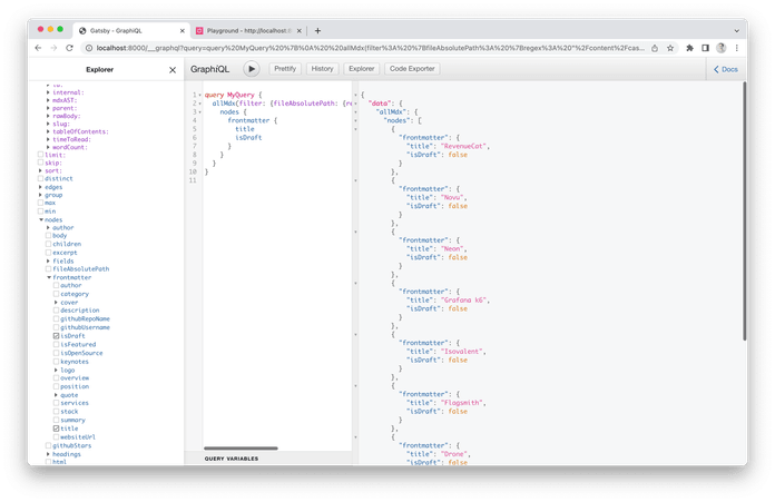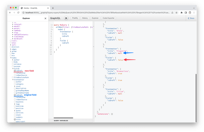 This code will be invoked on each Node creation, so it’s good to filter nodes there by certain parameters to add a field only to the relevant nodes. It’s a quick solution, but it is a bit raw. As you can see, the original isDraft field from markdown frontmatter data remains untouched, and we create a new one in that node under fields directory.