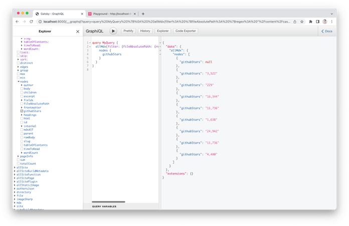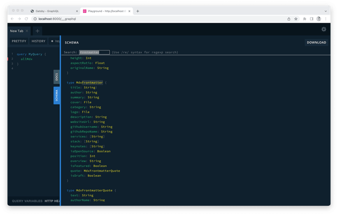 From Graphql Playground we can grab a type that used for markdown files, which will be Mdx, and then add a new field this way.