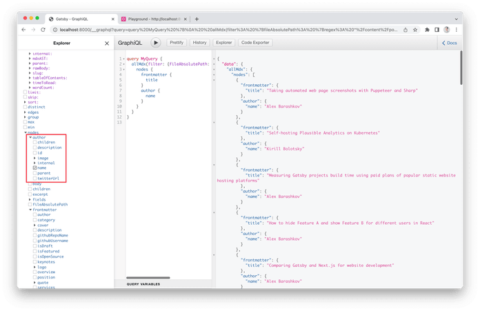 We use the same strategy as before: let’s open Graphql Playground. We already know the Graphql type of markdown files, but we need to find a type of JSON based nodes. In our case, it will be PostAuthorsJson .