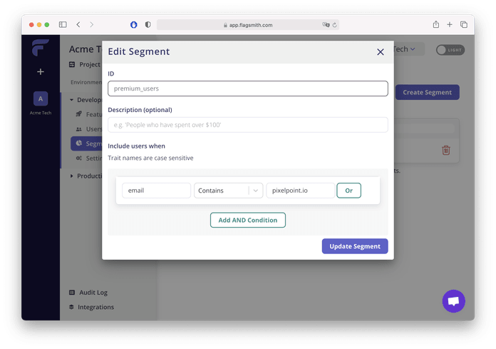 Let's create first segment and call it beta_opt_in . Go to Segments → Create Segment. Here you also could define an expression based on the trait which will add users that match that condition to the segment. We can start from a simple one, such as if email has [maxelpoint.io](http://maxel-point-website.vercel.app/) consider them as opted-in for beta features.