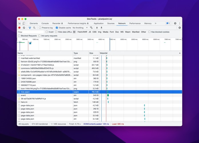 Once the component is mounted, Rive loads a separate WASM runtime library during initial initialization. Rive uses this library to control animations and interact with them. I suppose it is also the reason Rive performance is so much better compared to the alternative solutions like Lottie. This WASM module is not small and has a size of 78KB.